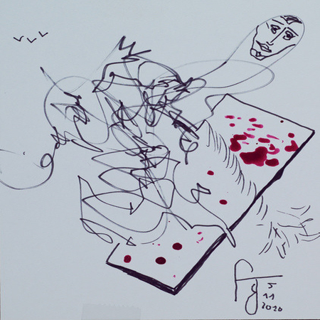 stylo et gouache / papier, 15,0 cm x 10,6 cm,     signature : bas droit,     date : 05/11/2010